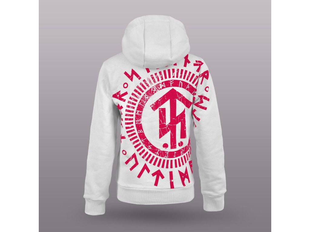 Dámská mikina na zip Thor Steinar s kapucí. Spodní lem a rukávové manžety jsou ze silného úpletu. Dvě boční kapsy. Dvakrát prošitá kapuca. Velký potisk na zádech a malý na hrudi.