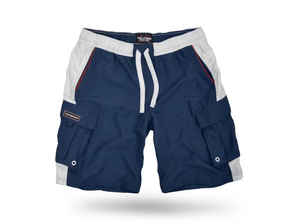 Pánské, krátké koupací a volnočasové šortky Thor Steinar z příjemného mikrovlákna. V pase stahování na šňůrku, dvě boční a jedna zadní kapsa na suchý zip. Vnitřní síťované spodky. Na stehně potisk .
