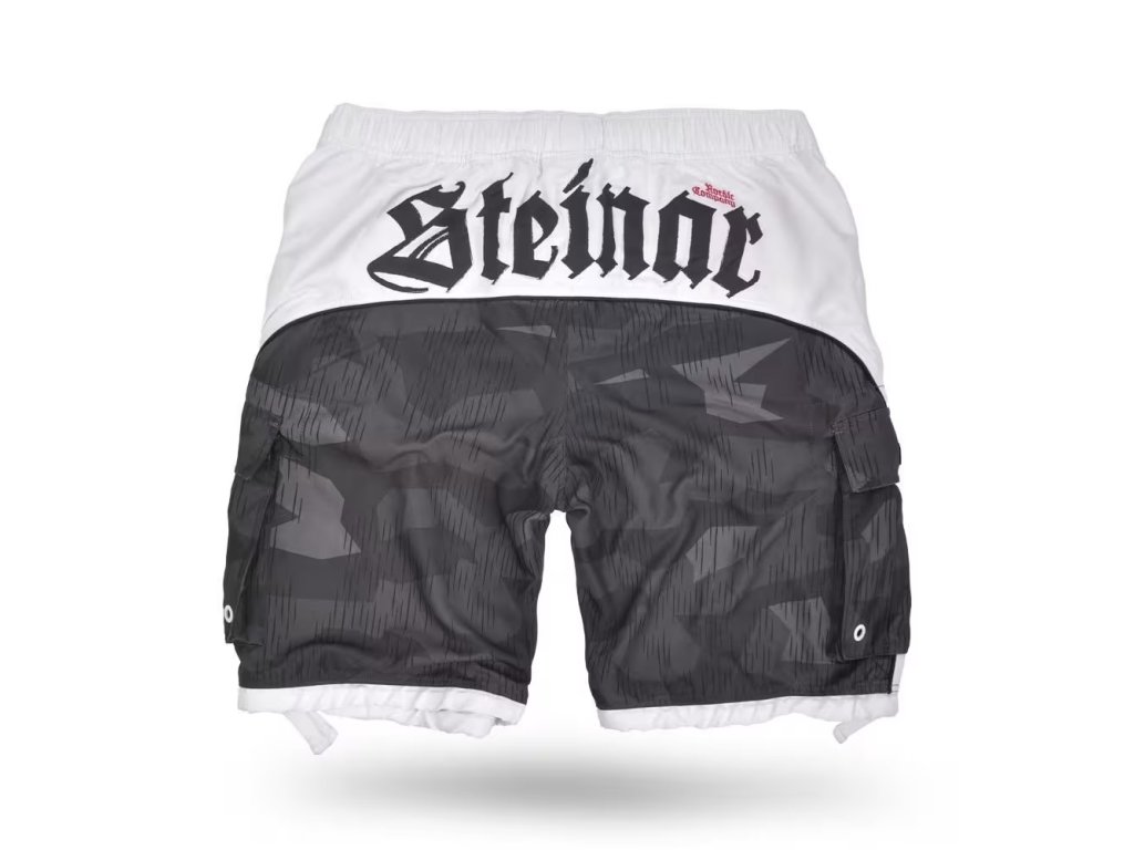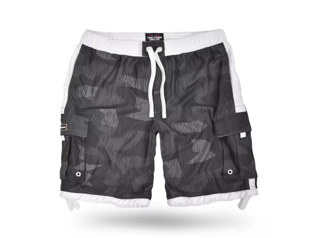 Pánské, krátké koupací a volnočasové šortky Thor Steinar z příjemného mikrovlákna. V pase stahování na šňůrku, dvě boční a jedna zadní kapsa na suchý zip. Vnitřní síťované spodky. Na stehně potisk .