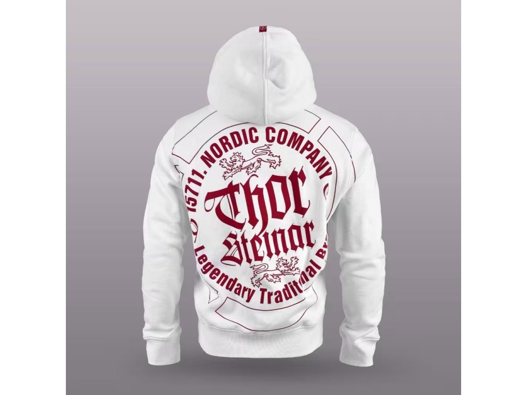 Pánská zipová mikina s kapucí Thor Steinar klasického střihu a velikosti. Dvakrát prošitá kapuce podšitá kontrastní látkou, dvě boční kapsy. Spodní lem a rukávové manžety jsou ze silného úpletu. Na zádech velký kvalitní potisk a na hrudi decentní výšivka.