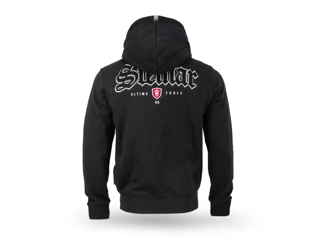Pánská zipová mikina s kapucí Thor Steinar klasického střihu a velikosti. Dvakrát prošitá kapuce podšitá kontrastní látkou, dvě boční kapsy. Spodní lem a rukávové manžety jsou ze silného úpletu. Na zádech velký kvalitní potisk a na hrudi decentní výšivka.