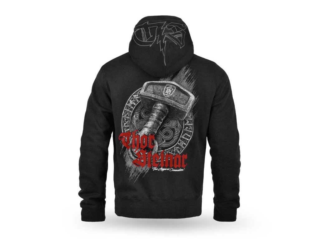 Pánská zipová mikina s kapucí Thor Steinar klasického střihu a velikostÍ. Dvakrát prošitá kapuce podšitá kontrastní látkou, dvě boční kapsy. Spodní lem a rukávové manžety jsou ze silného úpletu. Na zádech velká kvalitní nášivka a na hrudi decentní logo.