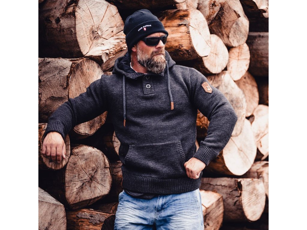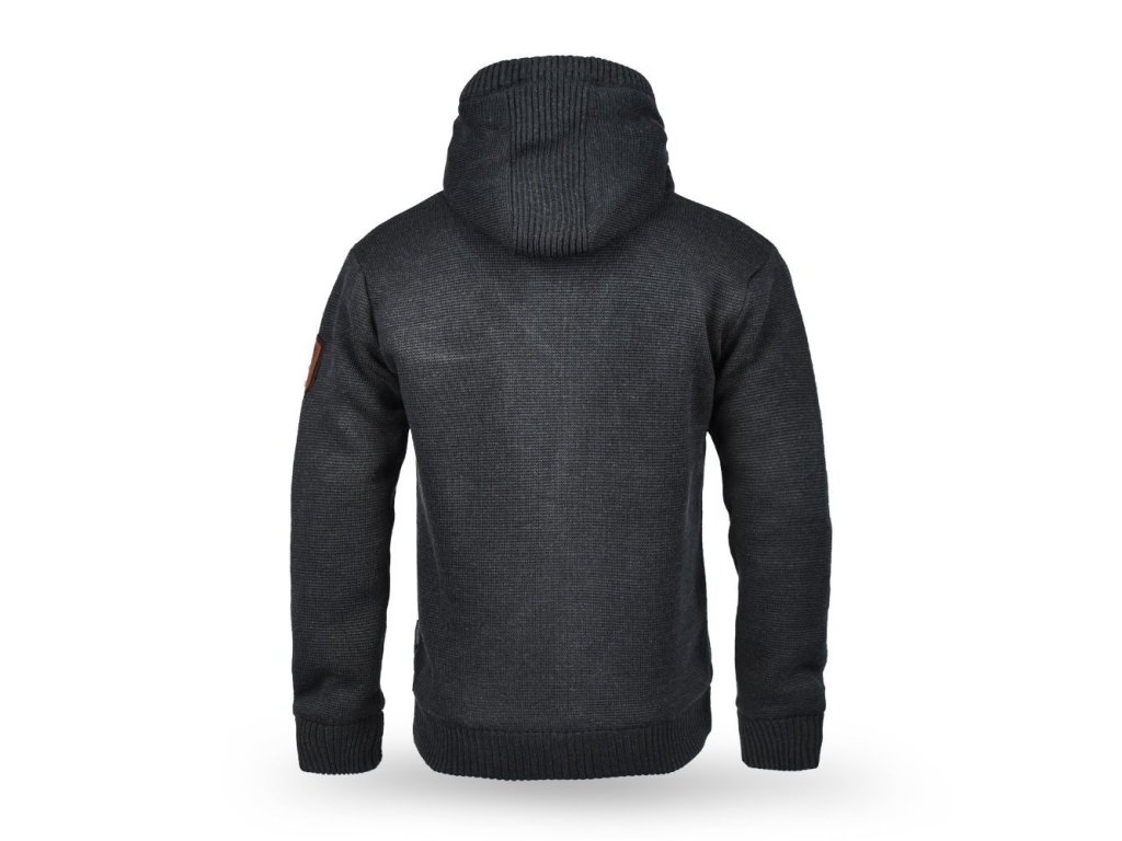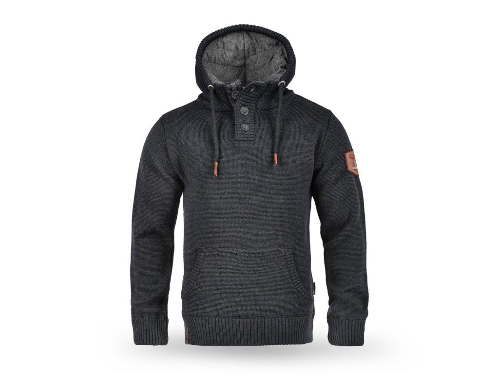 Pánský svetr Thor Steinar klasického střihu, vysoký límec se zapínáním na knoflíky, který chrání před nepříznivým počasím. Přední propojená kapsa - klokanka. Spodní lem a rukávové manžety jsou ze silného úpletu. Na rukávu logo