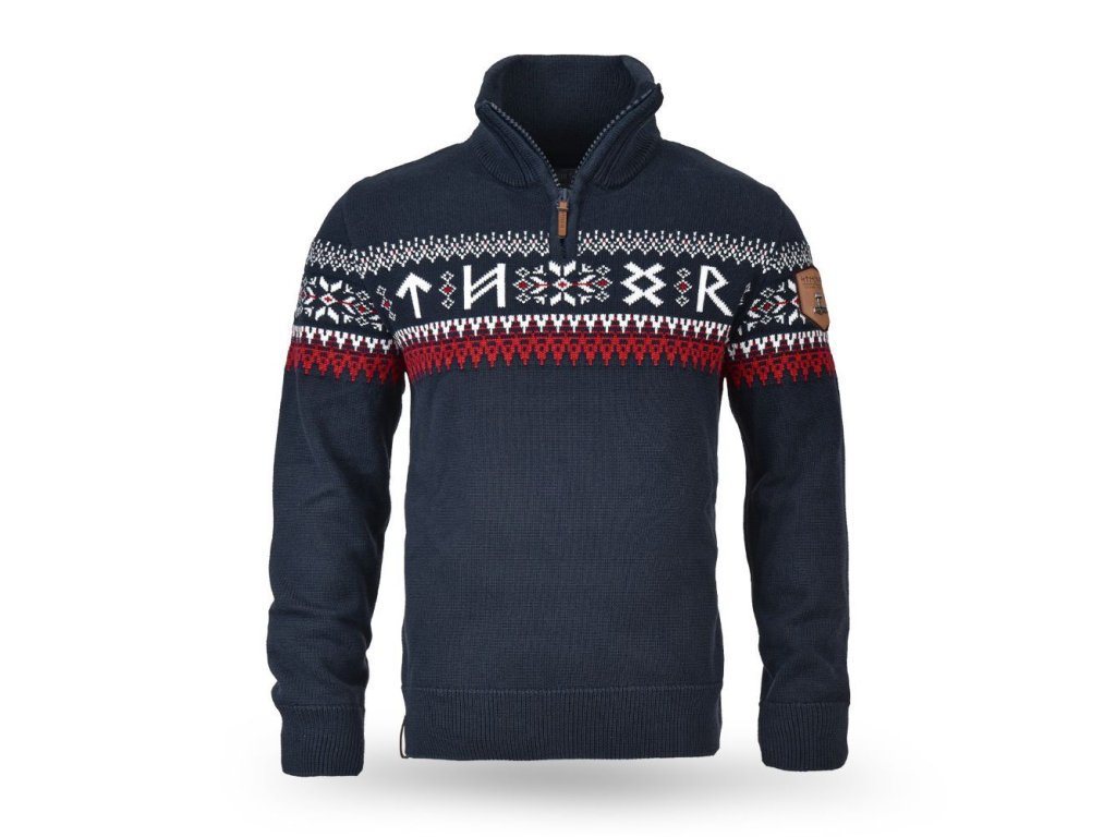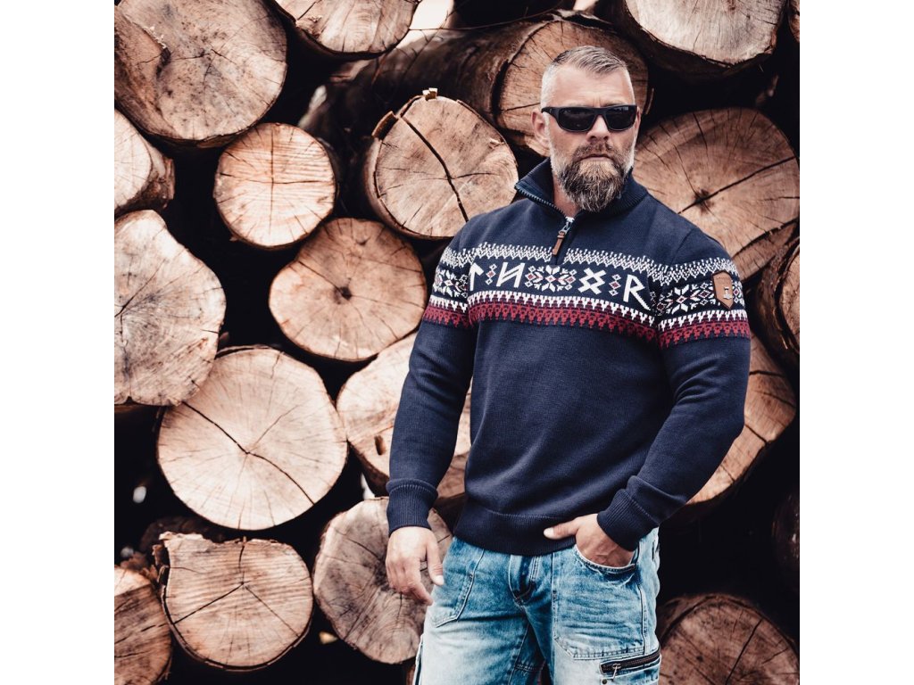 Pánský svetr Thor Steinar s norským vzorem, ve kterém vás žádné chladné počasí nepřekvapí, robustní hřejivý materiál,  vysoký límec uzavřený zipem, kožený štítek na lemu, kožený patch na rukávu