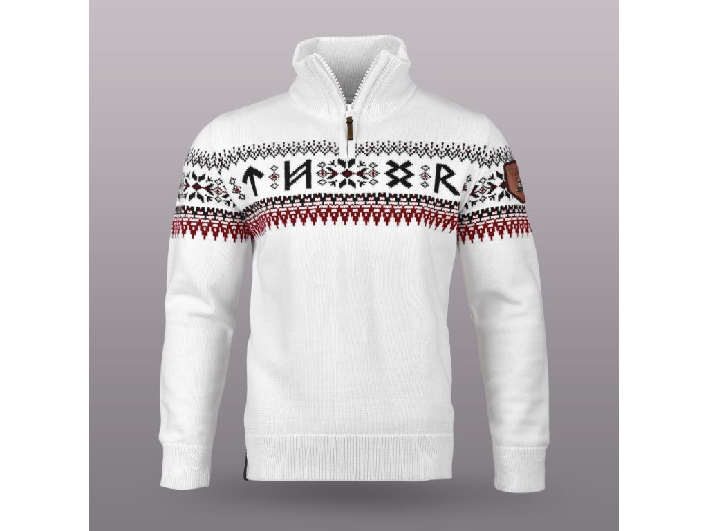 Pánský svetr Thor Steinar s norským vzorem, ve kterém vás žádné chladné počasí nepřekvapí, robustní hřejivý materiál, vysoký límec uzavřený zipem, kožený štítek na lemu, kožený patch na rukávu
